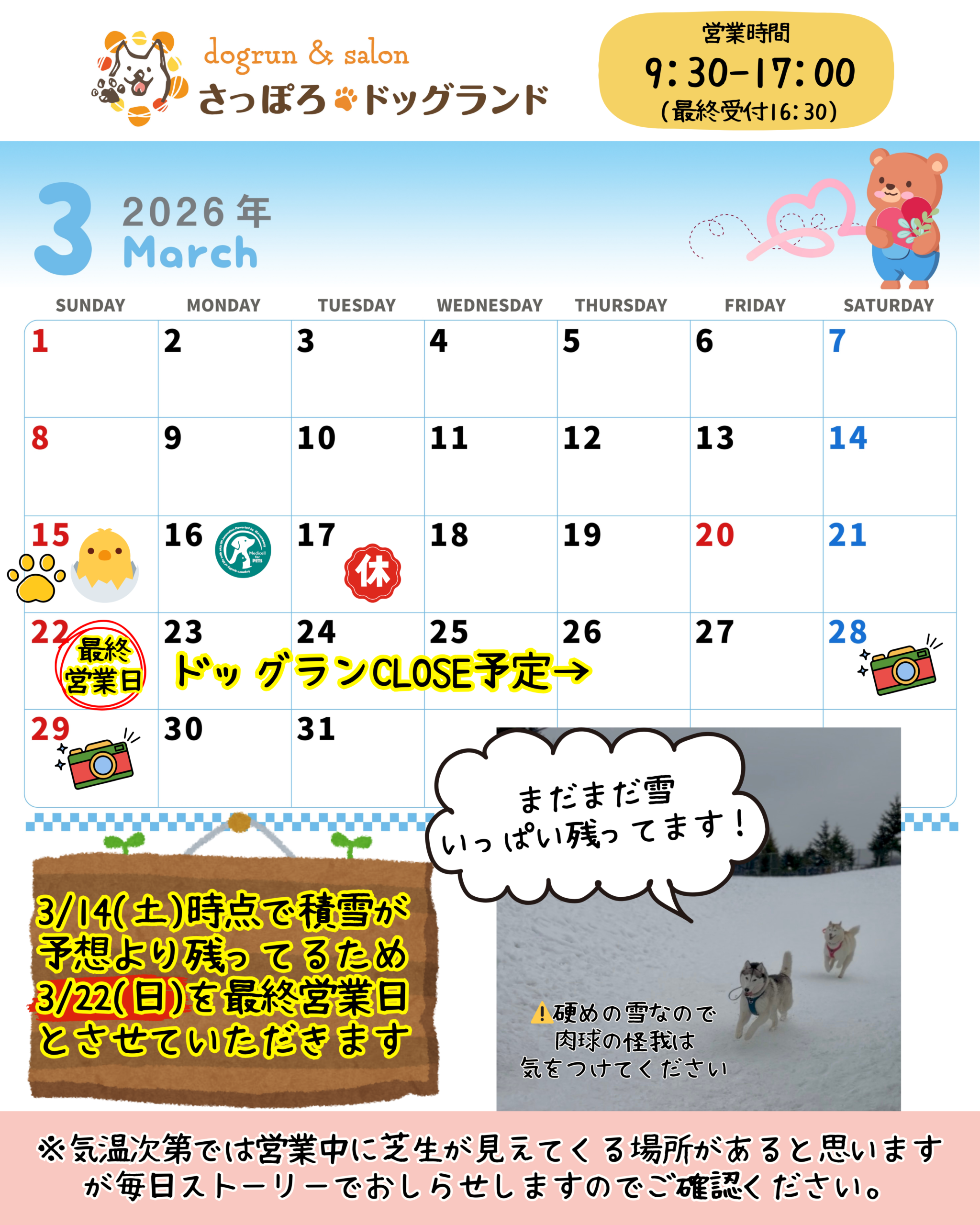 雪がまだ残っているため、3/22(日)まで営業します。